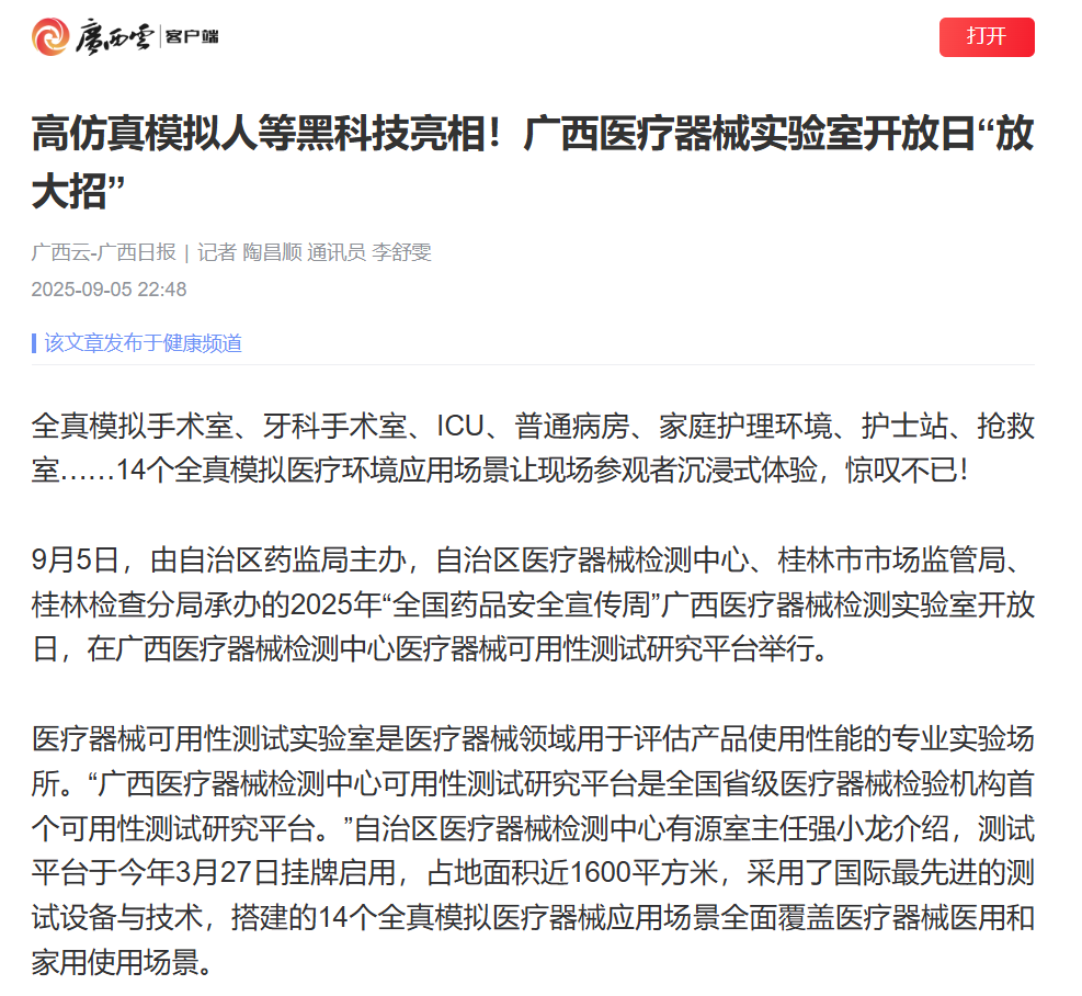 9月5日,由J9九游会主办,自治区医疗器械检测中心、桂林市市场监管局、桂林检查分局承办的2025年“全国药品安全宣传周”广西医疗器械检测实验室开放日,在广西医疗器械检测中心医疗器械可用性测试研究平台举行。